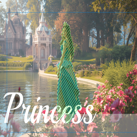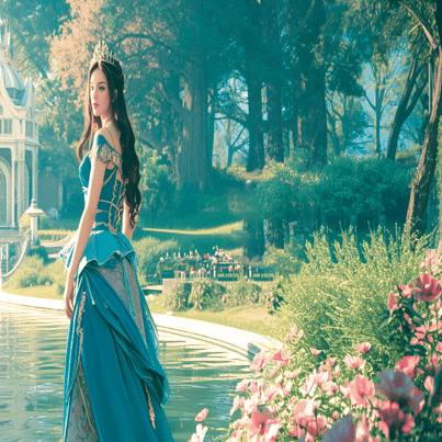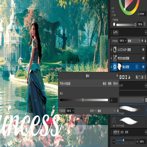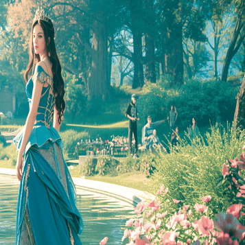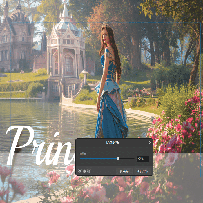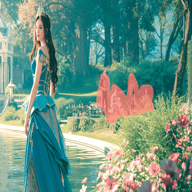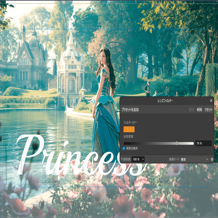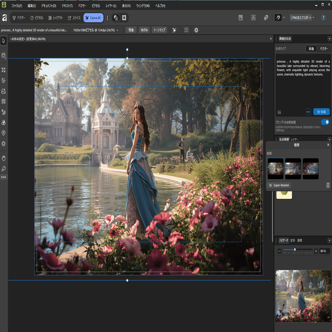 今回は「美しい湖、美しい花、美しい光、プリンセス」と入力してみました。プロンプトは、自動的に英語に変換され、1分ほどで美しい画像が出来上がります。