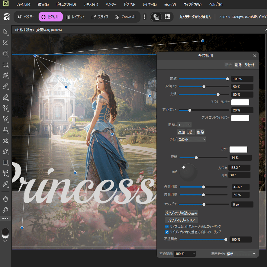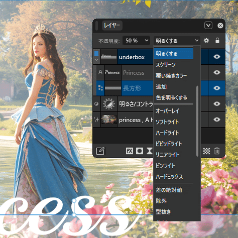 Affinityでは30種類以上のブレンドモードがあり、レイヤー同士の重ね方を変えることで光のかかり方を調整できます。