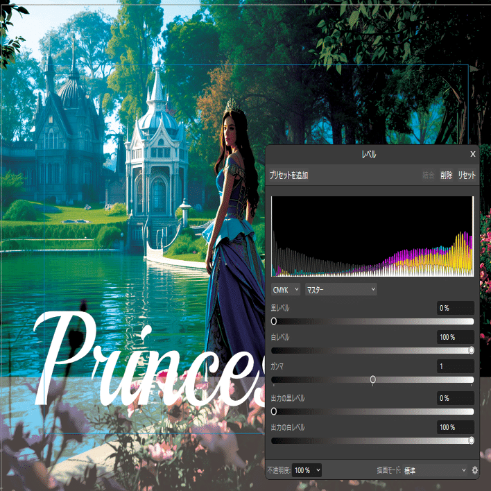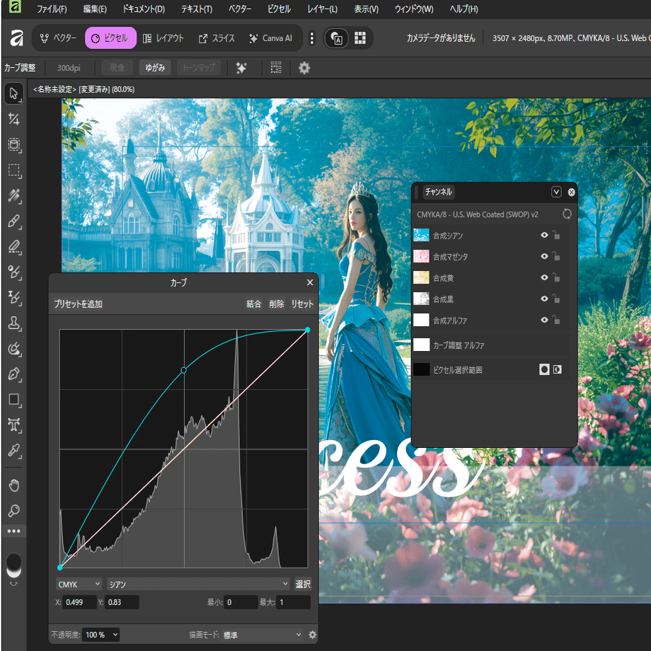 AffinityではRGB全体だけでなく、赤・緑・青それぞれのチャンネルを個別に操作できます。