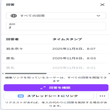 フォームをクリックし、メニューから「回答」を選ぶと現在の回答状況が表示されます。