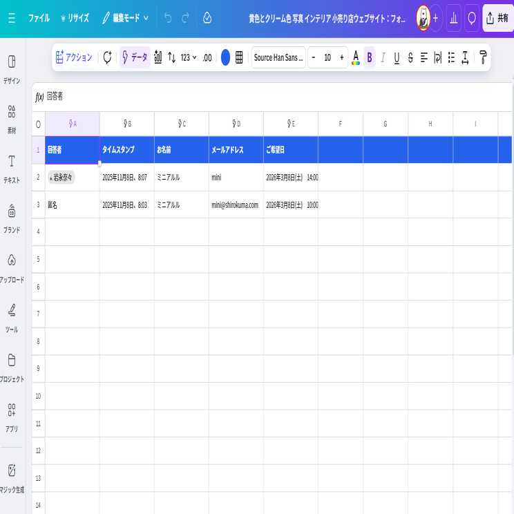 しかも、回答をリアルタイムでCanva内の「Canvaシート」に記録できるので、別ツールを行き来する必要がありません。