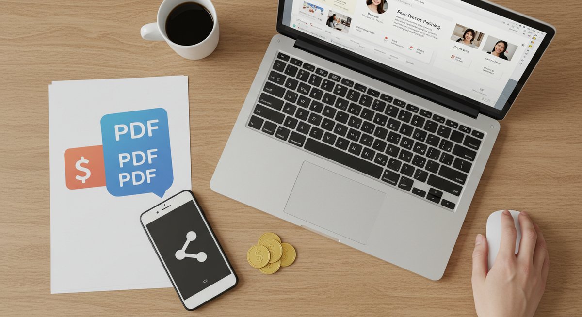 ダウンロードメニューから「PDF」を選び、必要なオプションを指定して保存します。形式は高画質や印刷用などを選べますが、用途に合わせて解像度やカラーオプションを選んでください。保存したPDFはメール添付やファイル共有サービスで送れます。