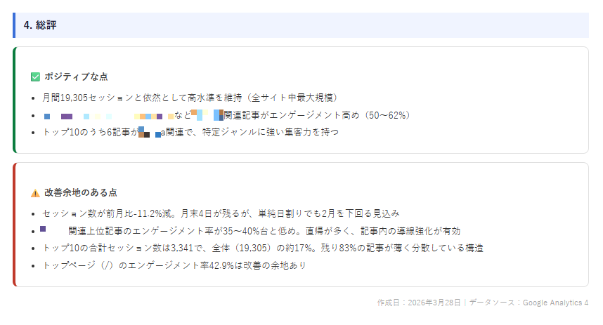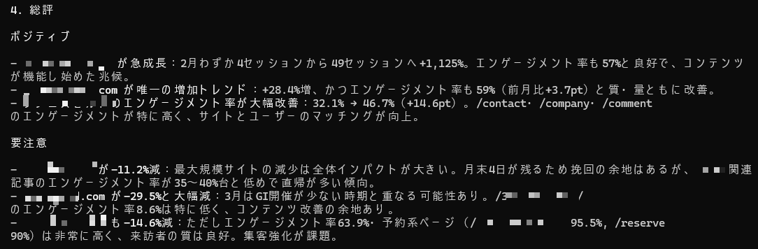 こんな感じで、ClaudeがGA4のデータを取得し、わかりやすいレポートをまとめてくれました。HTMLファイルでレポート作成を指示したら、キレイなHTMLレポートファイルを生成してくれたのでお客さんにはHTMLで送るといいかも。