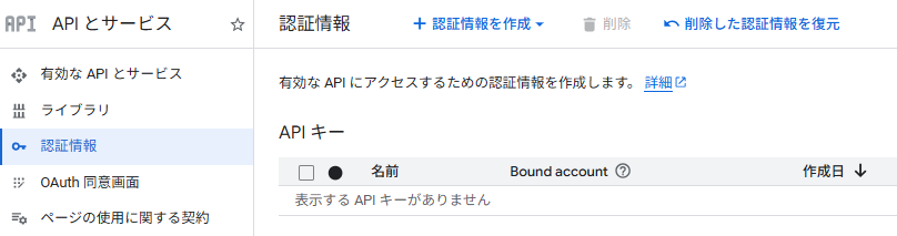 • Google Cloudコンソールで、左メニューのAPIとサービス > 認証情報を選ぶ