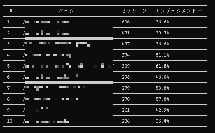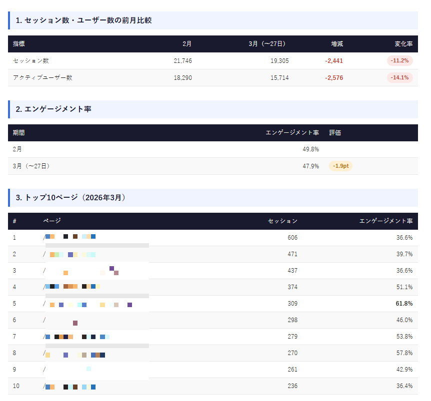 先月から比較してセッション数の変化、トップ10ページ、エンゲージメント率の表示、総評を入れた月次レポートを作って、HTMLファイルで保存して。」