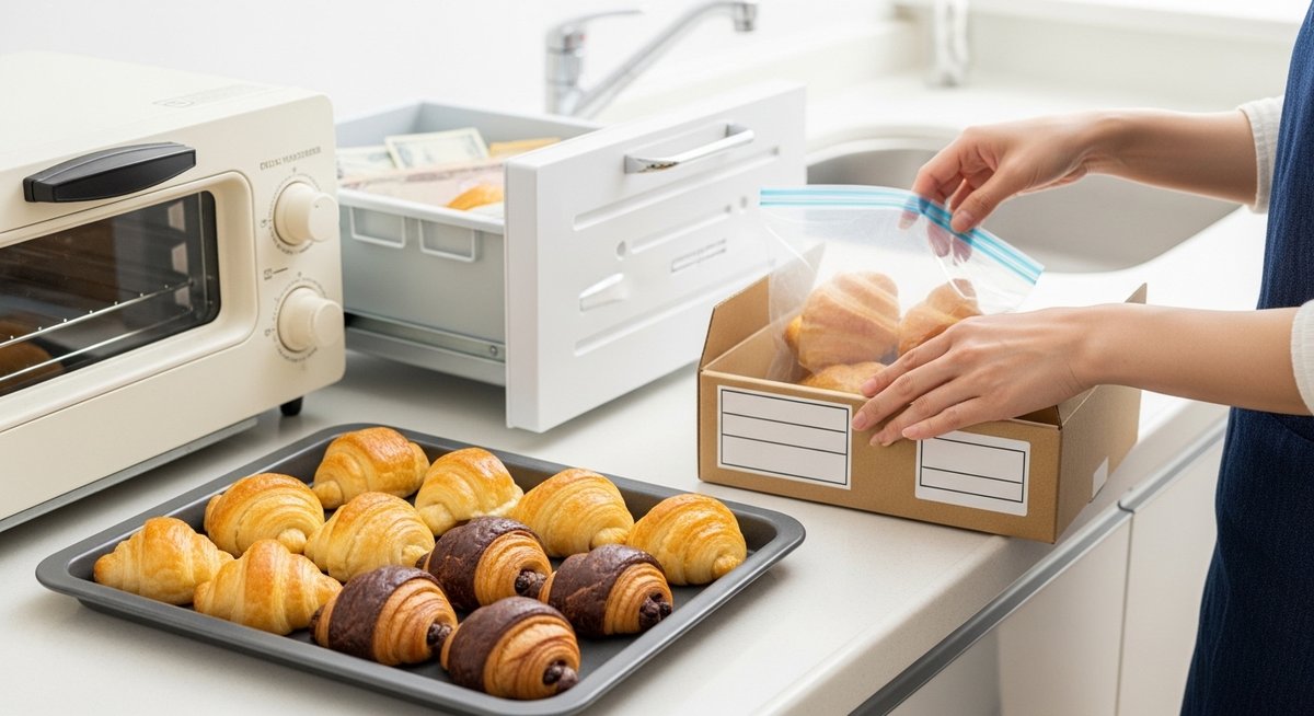 美味しいクロワッサンが届いたら、その鮮度をいかに長く保つかが重要です。特に、大容量セットを購入した場合は、保存方法一つで1週間後の味が大きく変わります。パンの大敵は「乾燥」と「酸化」です。届いた時の袋のまま冷凍庫に入れておくと、わずかな隙間から乾燥が進み、いわゆる冷凍焼けの状態になってしまいます。