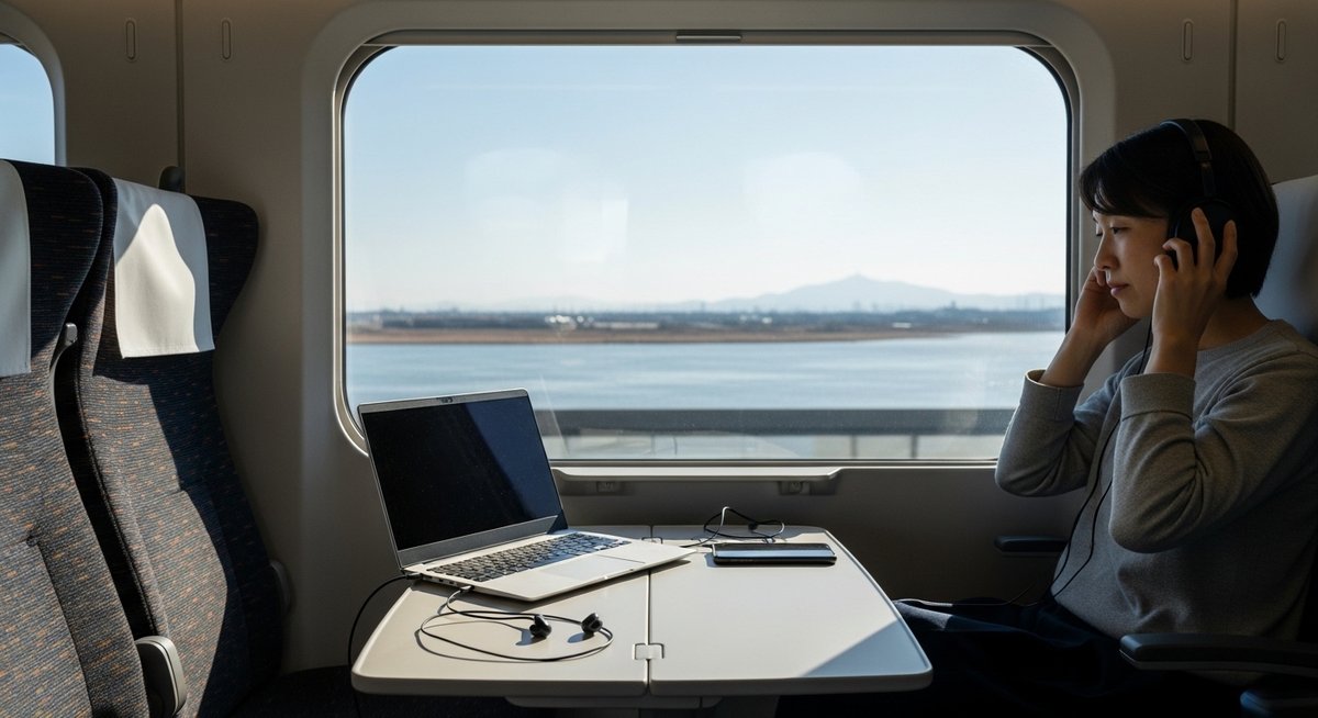 これらのデバイスは、車内の走行音やキーボードの打鍵音を劇的に軽減し、自分だけのプライベートな音響空間を作り出してくれます。お気に入りの集中用BGMを流せば、そこはもう新幹線の中ではなく、世界で一番快適な自分専用の書斎に早変わりします。