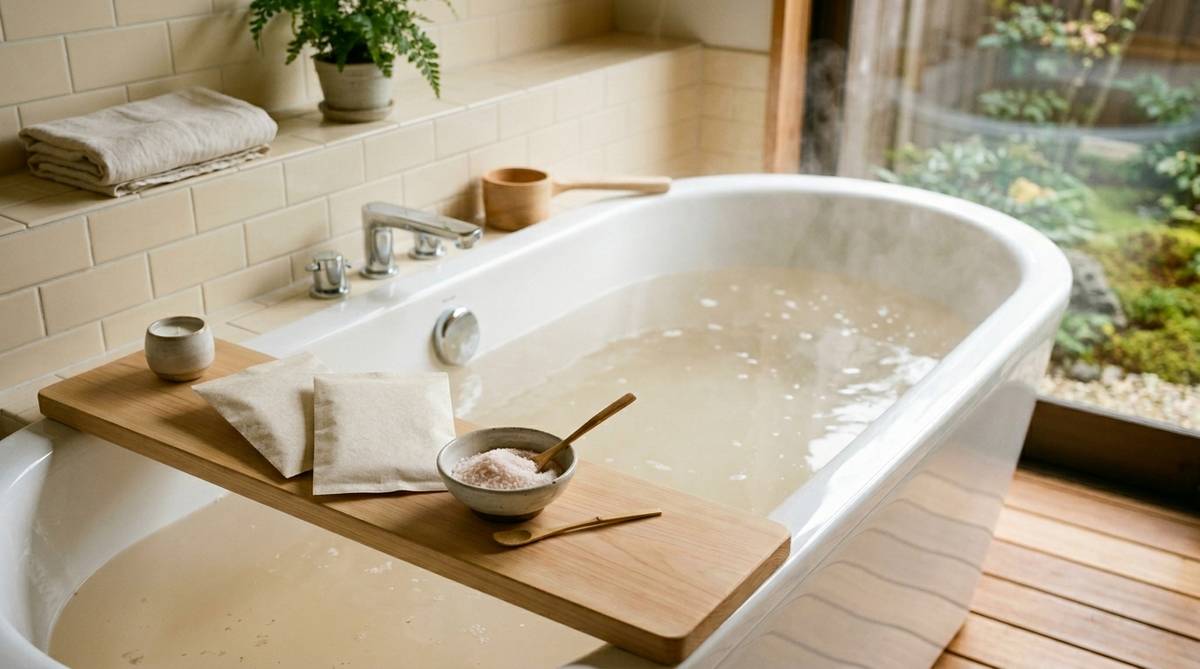 ぬるめのお湯に20分程度浸かることで、アルカリ成分や保湿成分がじっくりと肌に馴染んでいきます。