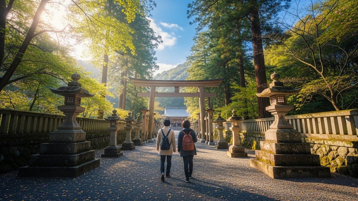 山間部や参道は起伏や石段がある場所が多いので、スニーカーやトレッキングシューズのような歩きやすい履物を選んでください。季節によっては朝晩の気温差が大きいため、重ね着できる服を用意すると体温調節がしやすいです。雨天時は滑りにくい靴と防水対策があると安心です。