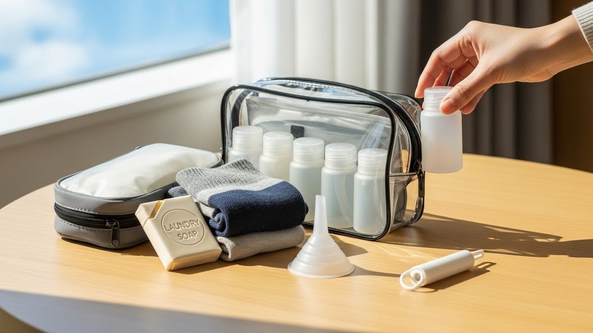 おすすめは:液体用の真空キャップ付きボトル、粉末用の小さな密閉容器、使い切りパウチを作るための小さな計量スプーンです。出発前に家庭で漏れ検査をしておくと安心です。安価ですが繰り返し使えるため旅先で捨てる必要も減ります。